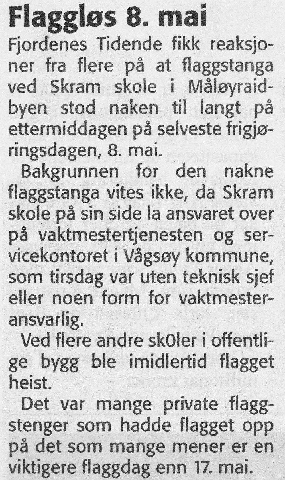 Meldinga om den tyske kapitulasjonen kom kvelden 7. mai. Den 8. mai 1945 vakna folket til fred. Flagga vart henta fram. "Den 8. mai gjekk det trifarga vakre flagget vårt atter til topps på flaggstengene, og falda seg ut (...)", skreiv Fjordabladet på Nordfjordeid i første nummeret sitt etter frigjeringa.