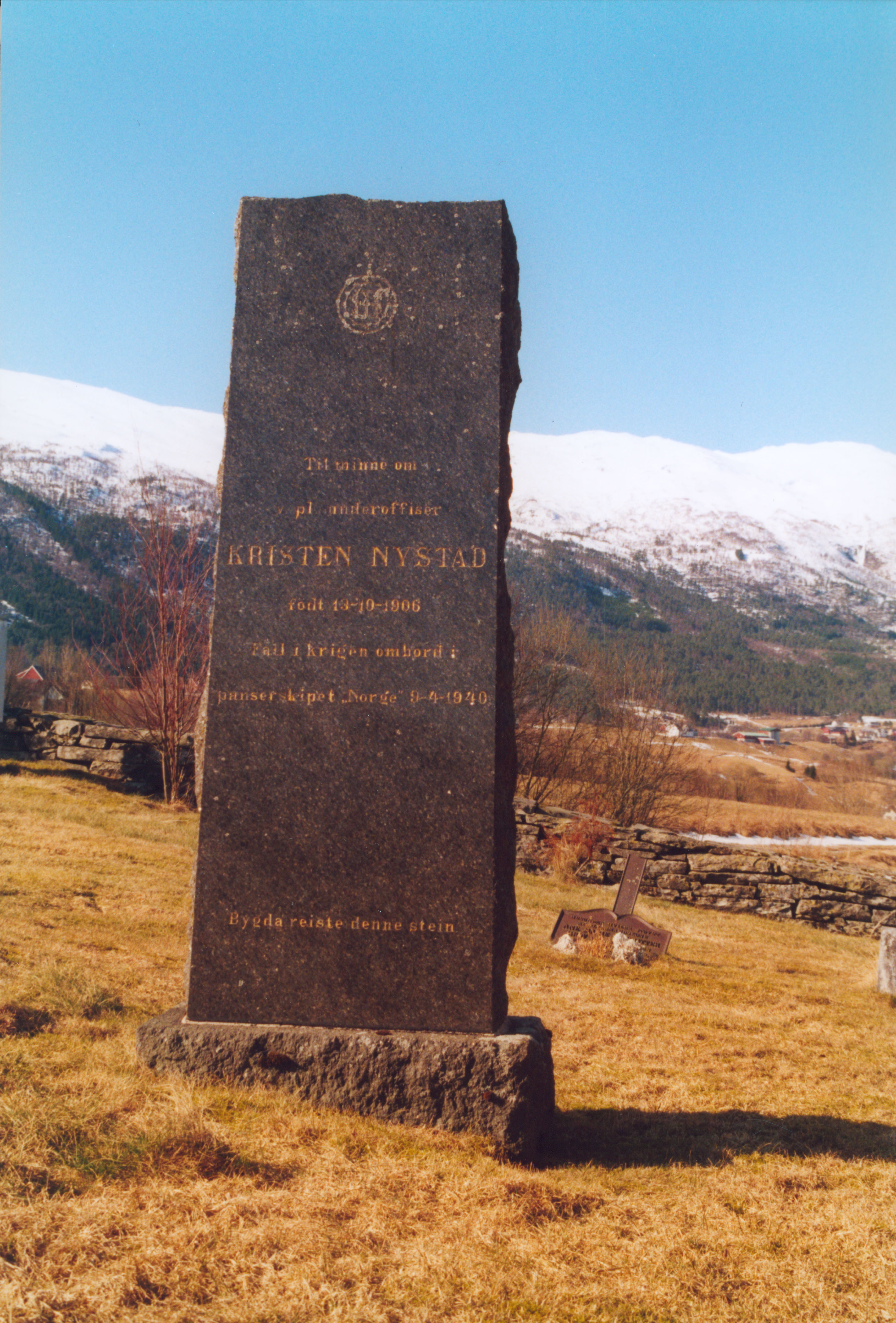 Til minne om * v.pl. underoffiser * KRISTEN NYSTAD * født 13-10-1906 * falt i krigen ombord i * panserskipet "Norge" 9-4-1940 (Nede på steinen:) Bygda reiste denne stein