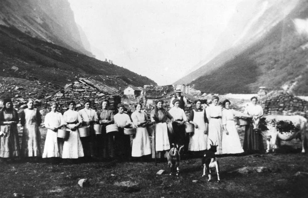 Milk maids at Langhuso about 1918. At that time there were 11 farms and some smallholdings at Undredal.