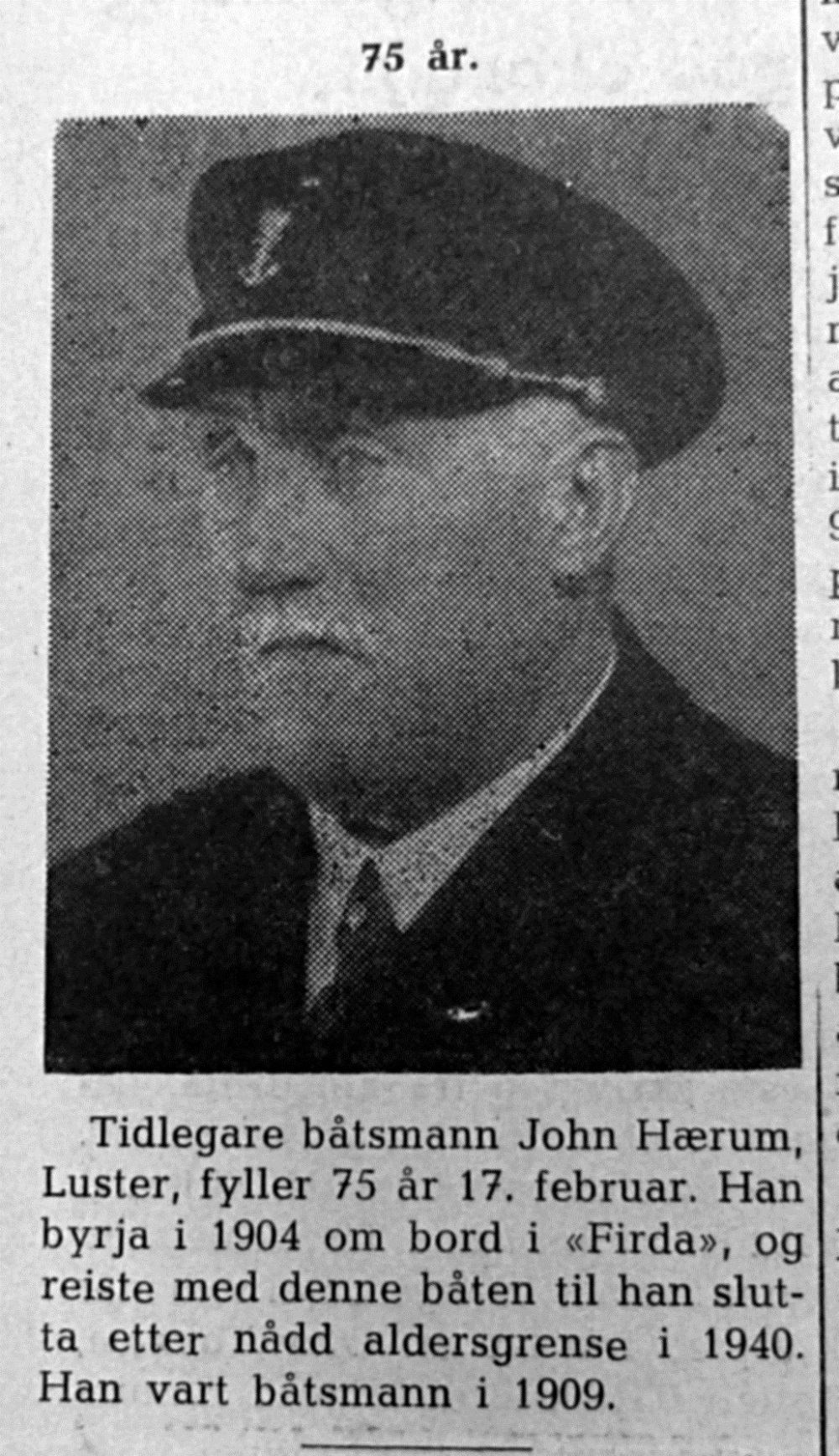 «Jeg ser i «Sogn og Fjordane» for onsdag 16. februar at båtsmann John Hærum fylte 75 år, og samtidig bilde av hans velkjente ansiktstrekk. Da jeg var forsent oppmerksom på denne dagen hans, fikk jeg ikke sende ham noen hilsen til dagen, hvilket jeg meget beklager, men vil herved sende ham en.