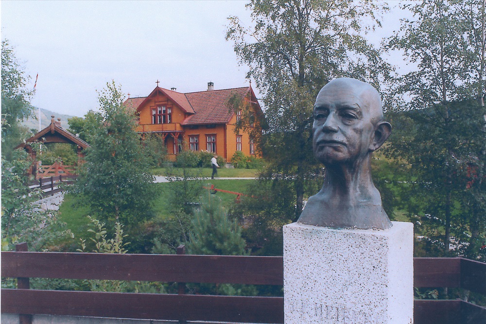 Bust of the founder, Gert Falch Heiberg (1871-1944). In the background 'Helgheimstova' - the first school building of 'Sogndal folkehøgskule' dating from 1874.