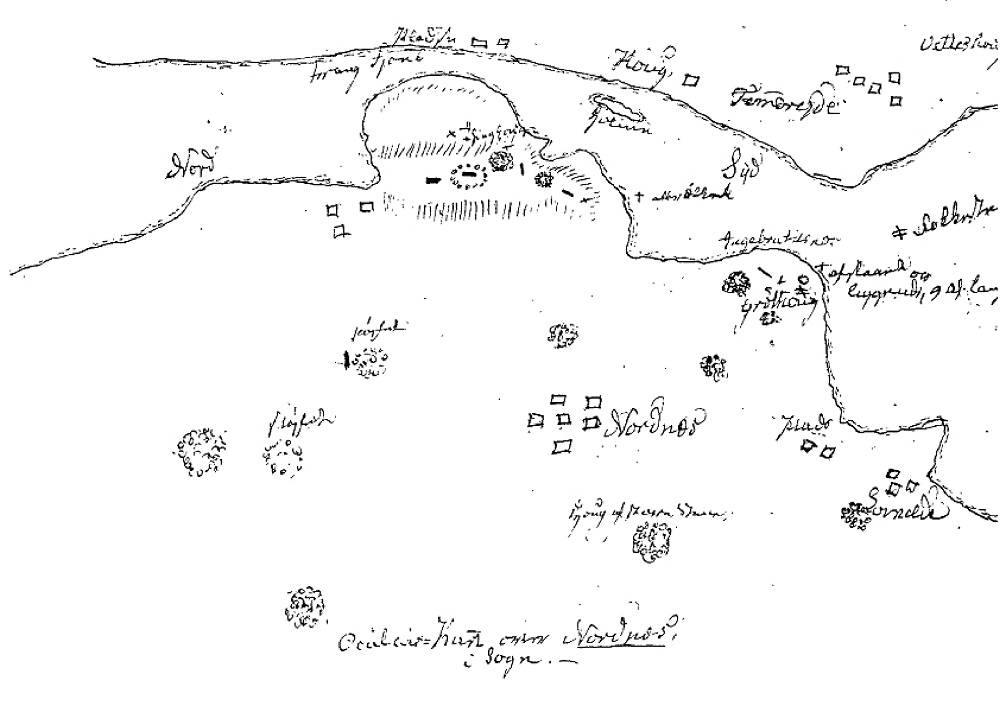 Danekongen var skyldingen [skylding - slektning] hans. Mange [var danar av dei] som kom i jordi på Nornes desse dagarne. Etter som åri sidan skreid, fastna kongedømet åt Sverre, folk tydde seg til han [heldt med han] og og til den gjæve ætti hans om etter fylgde. Men stendigt påny kom ufredsflokkar frå Danmark. Danemnamnet vart hengjande på gravstaden og seint gløymt. Danøyri - øyri der danane vart jordfeste.