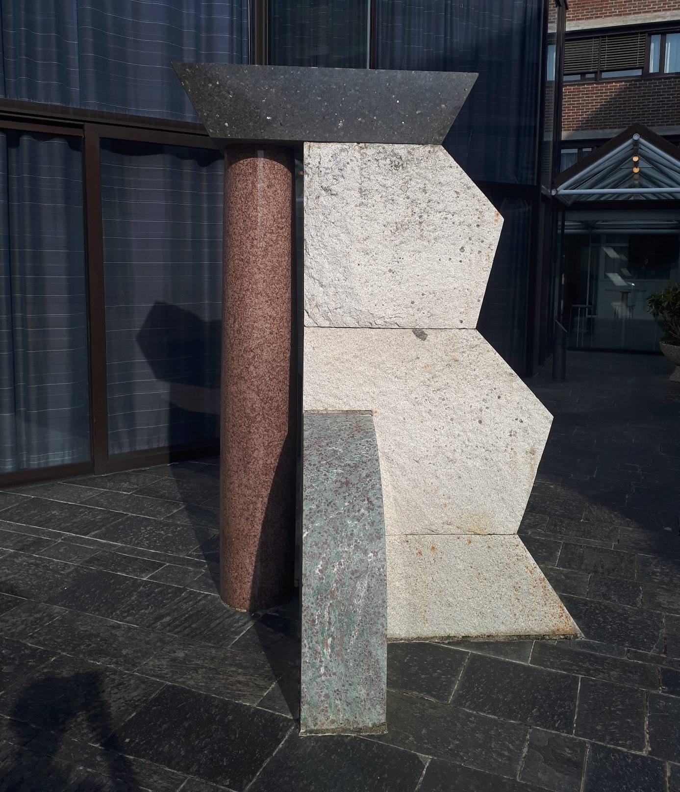 Eklogitt er ein av seks bergartar brukt i steinskulptur ved Fylkeshuset på Hermansverk (nede, «kvilande inn til hovudkonstruksjonen»).
