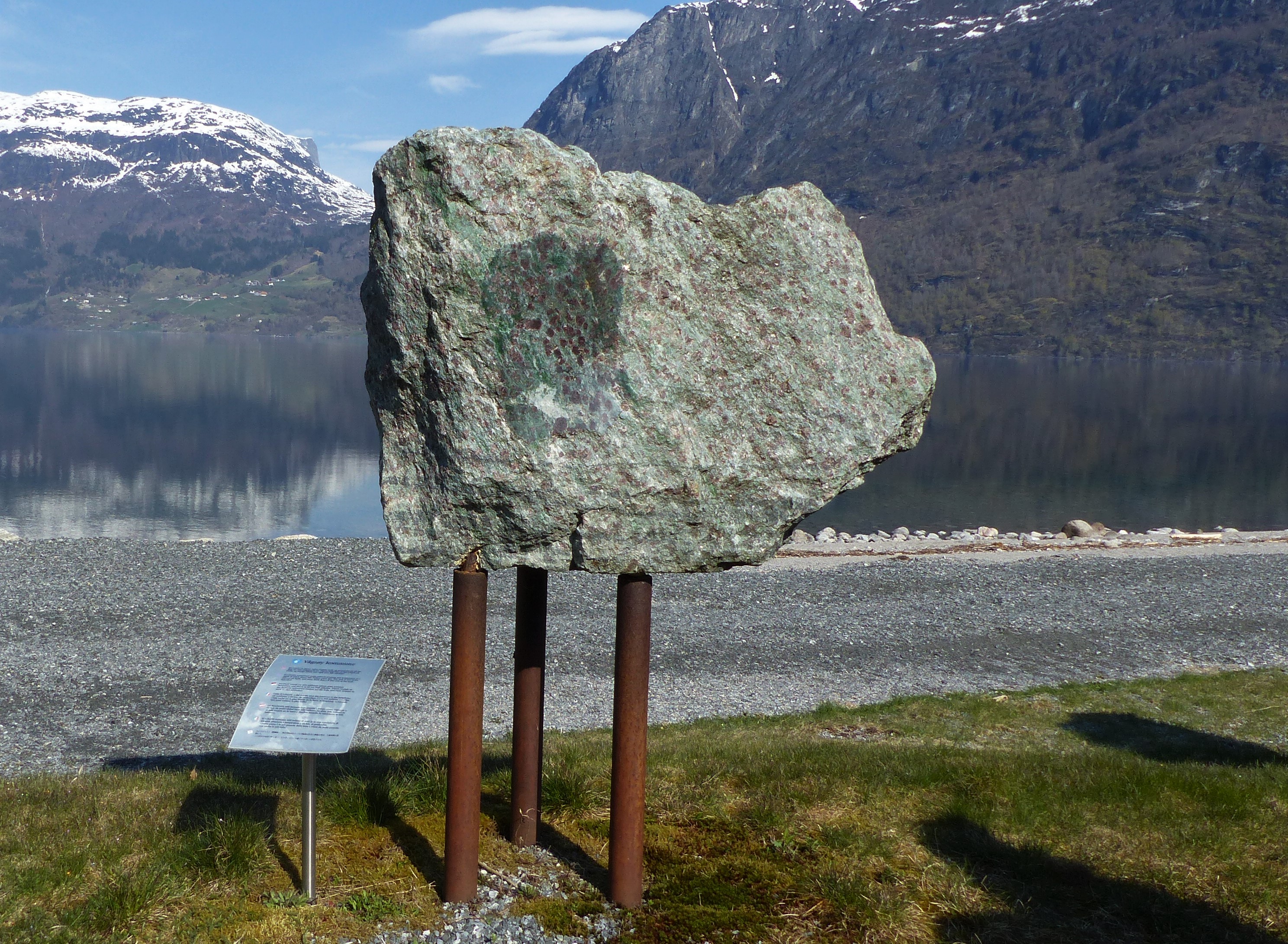«Kvilande inn til hovudkonstruksjonen polert grønleg eklogitt frå Verpeneset i Vågsøy. (Eklogitt vert rekna som fylkesstein i Sogn og Fjordane.)»