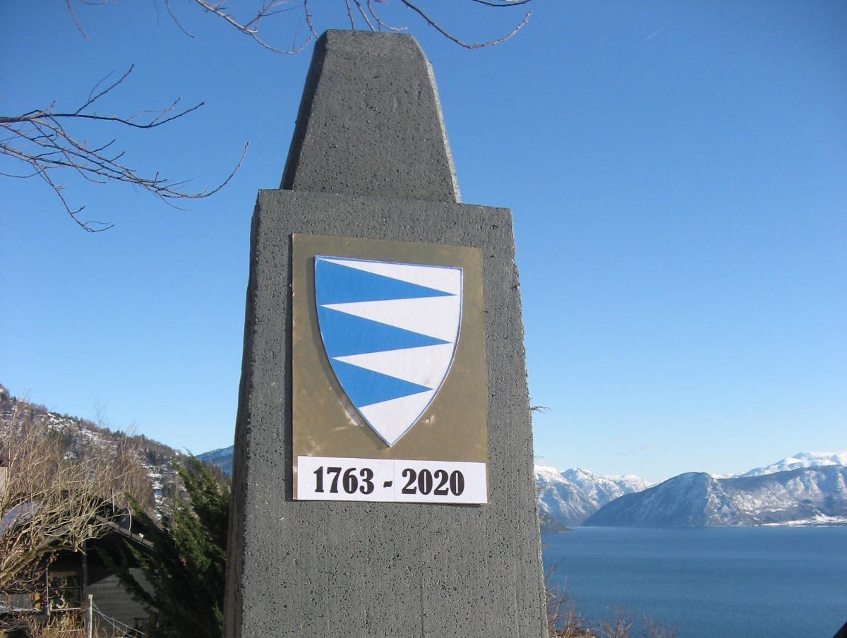 Fylkessteinen til Sogn og Fjordane fylke (1763-2020), ved inngangsdøra til Fylkeshuset på Hermansverk.