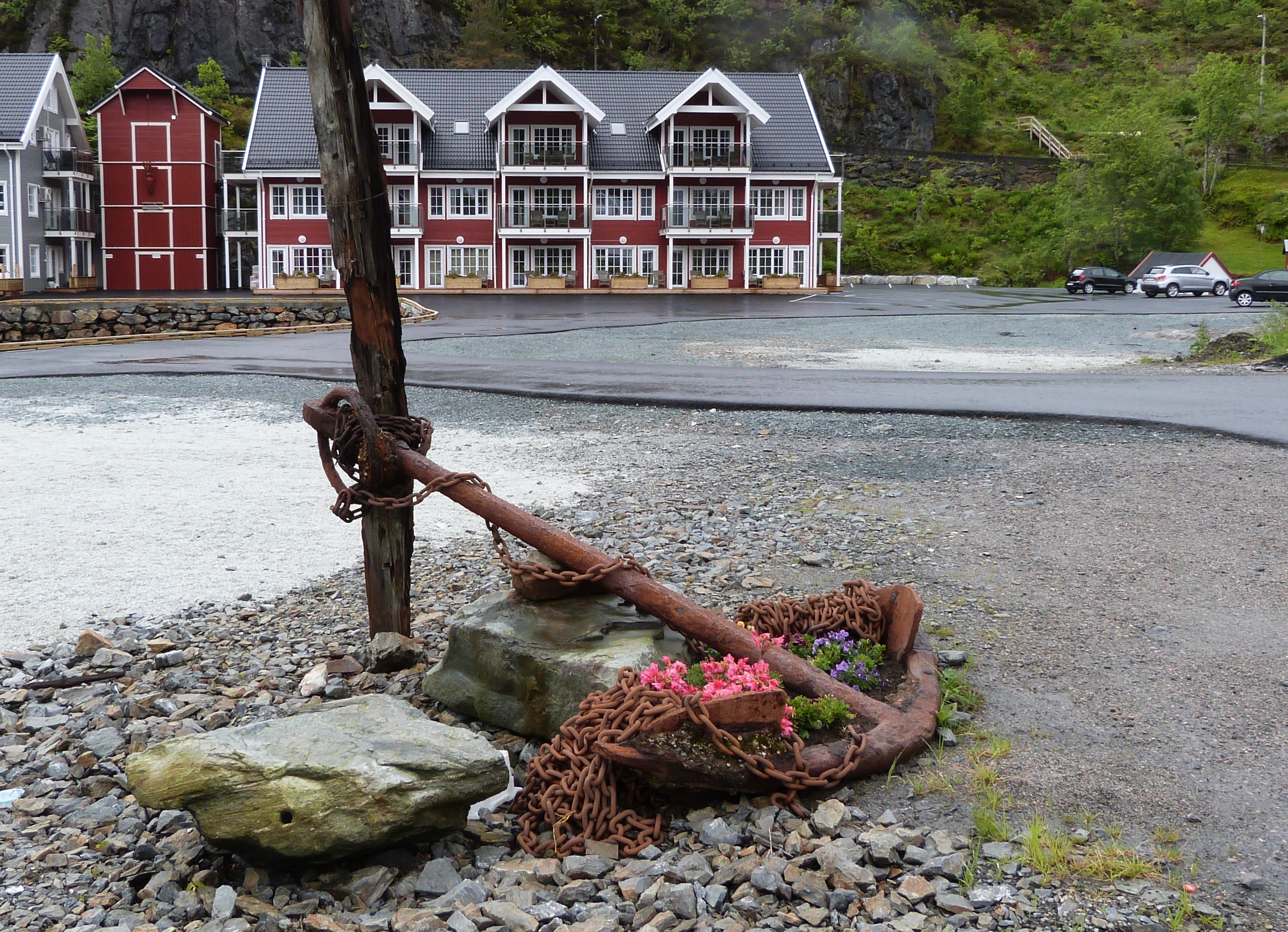 - viser godt i «landskapet». Leggen er halden oppe av eit 3-4 meter langt trestykke, som ser ut til å vera frå eldgammalt skipsmaterial, men ikkje frå den originale stokken, det er trestykket for langt til. Ankeret er rusta og rustbrunt. Somme stader, særleg ved ankerringen, ser ein restar etter avleiring på sjøbotn; skjell, sand/leire, og ein taustump. Det «fortel» at ankeret må ha lenge lenge på havsens botn, og at det ikkje har blitt finpussa etter at det kom på land. Ankeret er staffert med kjetting av nyare dato og blomsterplanting.