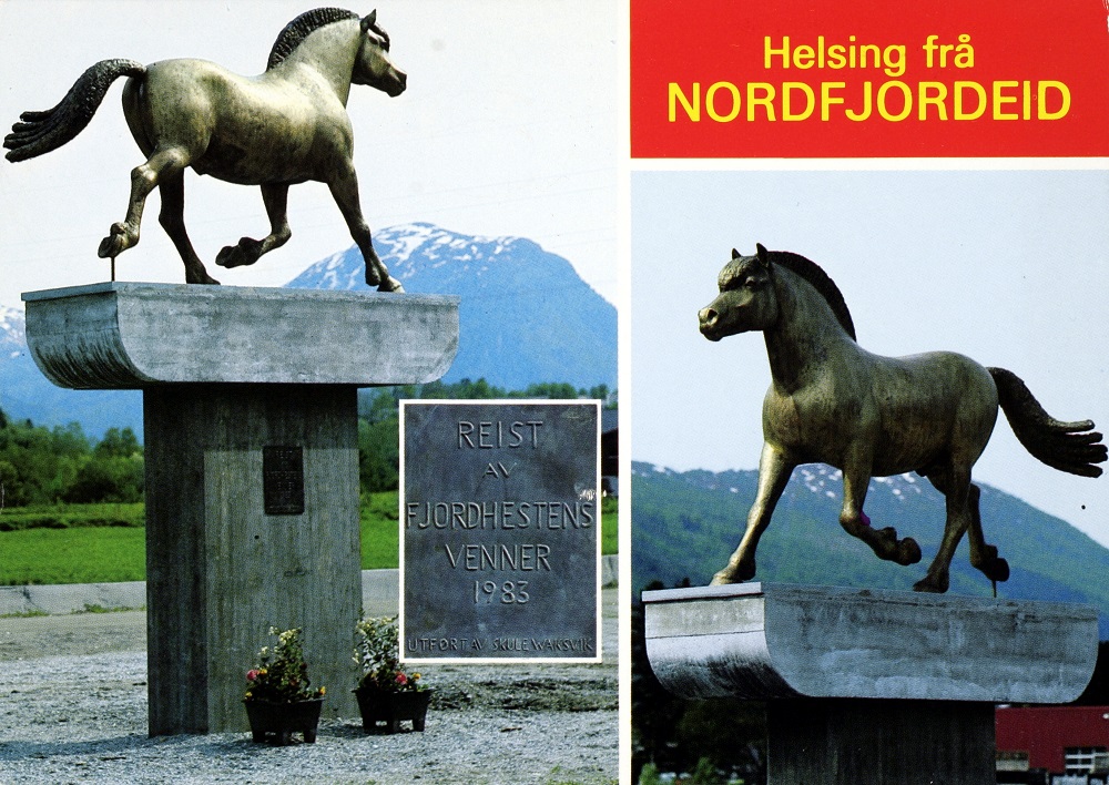 Fjordhest-statuen står på utstillingsplassen i Øyane på Nordfjordeid. Plassen ligg på oppsida av riksvegen frå Lote, like etter brua over Eidselva. "På sin høge sokkel møter bronsehesten alle tilreisande frå sør i fullt firsprang", skreiv Jul i Nordfjord i årskavalkaden sin i 1983.