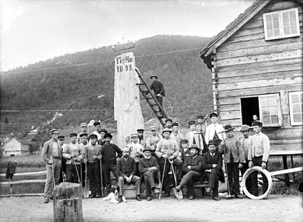 Telefonarbeidarane i 1893 fotografert framfor stasjonen på Grodås. På kista framfor steinen sit entreprenøren for anlegget, ing. Hans Sivertsen (Hans Wingaard Friis). Til høgre for han, Hans J. Holmø, som var ein av iniativtakarane og pådrivarane for telefonen.