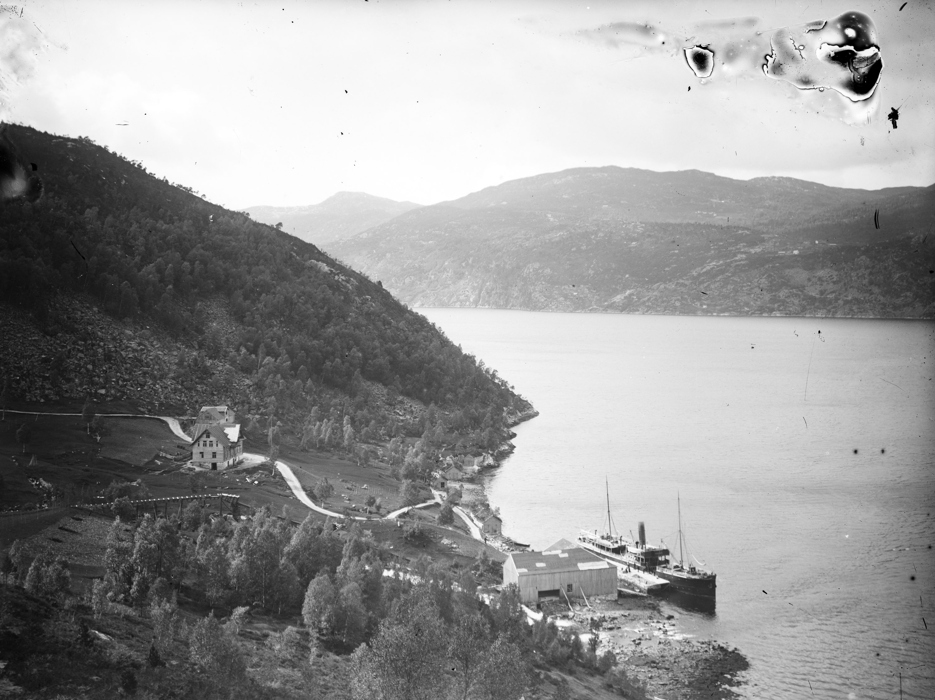 Bryllaupet til Inga og Alfred Torvik 17. juni 1907 i Naustdal. Biletet er teke på dampskipskaia i Naustdal. Dei er ferdig i kyrkja og ventar på båt som går til Ervika, der bryllaupsfesten var.