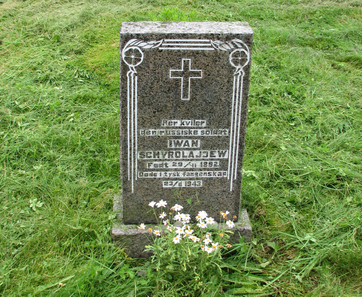 Tillegg 2015: Jørn Fossheim frå Høyanger, busett i St. Petersburg, har studert krigsfangekortet og kome fram til at namnet på minnesteinen ikkje kan vere rett. På steinen står det Iwan Schvroladsew, men det korrekte namnet hans var Iván Ivánovitch Shirolápov. Jørn har i tillegg funne ut at kona til Ivan heitte Lukerja Shirolapova. Dei var busette i Blagodarnoe, som ligg i Stavropól'skij kraj i Russland.