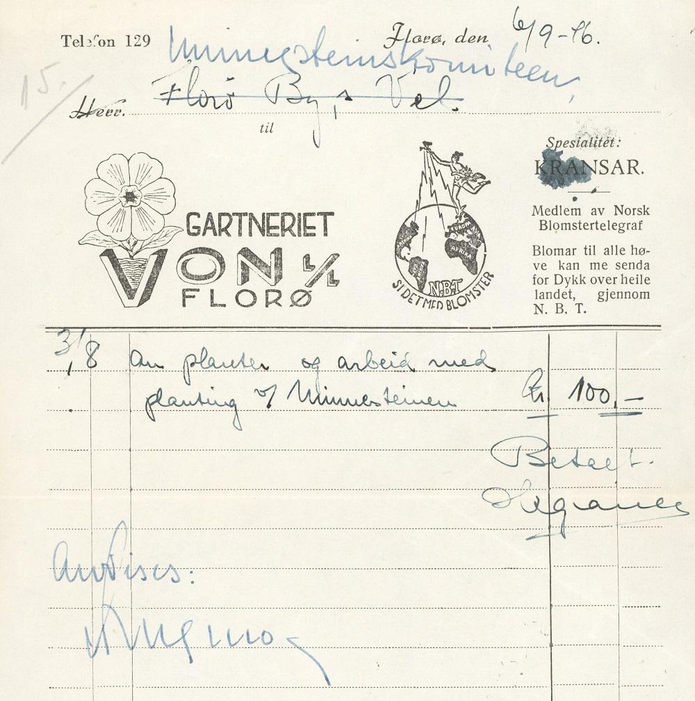 Facsimile of invoice from the nursery Gartneriet Von L/L, Florø, to the memorial committee for plants and work at the stone, dated 3 August 1946, shortly before the unveiling ceremony.