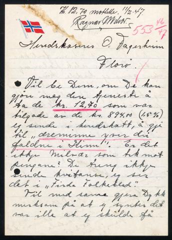 "Will ask you, if you can please do me the favour of accepting the 12.70 kroner that I paid too much in municipal taxes and give the money to "the memorial of those people from Kinn who died in the war". Is it not Mr Milvær who is supposed to get the money? You do not have to send a receipt as I can read about my donation in the paper "Firda Folkeblad" ". The letter was forwarded to Ragnar Melvær who duly noted that the money had been received.
