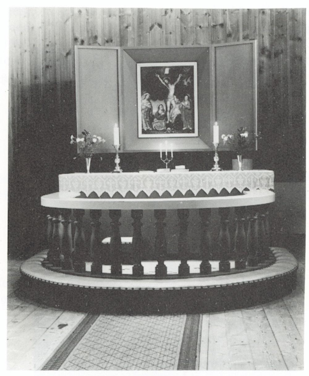 The altarpiece from 1962 is made as a triptych, but the doors are without pictures or any other decoration. In the middle there is a painting of Christ on the cross, and three female worshippers, probably Mary, Christ's mother, Mary Magdalene, and Salome. The inscription on the cross is in Latin and is in translation: "Jesus from Nazareth, King of the Jews". In the middle of the picture, words from the Scriptures are painted which interpret the picture: "Behold the Lamb of God which Taketh away the sin of the world" (from John 1,29), and "In Truth He Bore our Illness And Took Our Pain" (from Jes. 53,4). The artist is not known, but the inscription below identifies the donors: "Jesu Tienere oc Tienerinde Fendrich Offu Christianson og Dyd Ædle Barbro Danniels Datter Bugge 1692 (the servants of Christ lieutenant Offu Christianson and the virtuous honourable Barbro Danniel's Daughter Bugge 1962)".