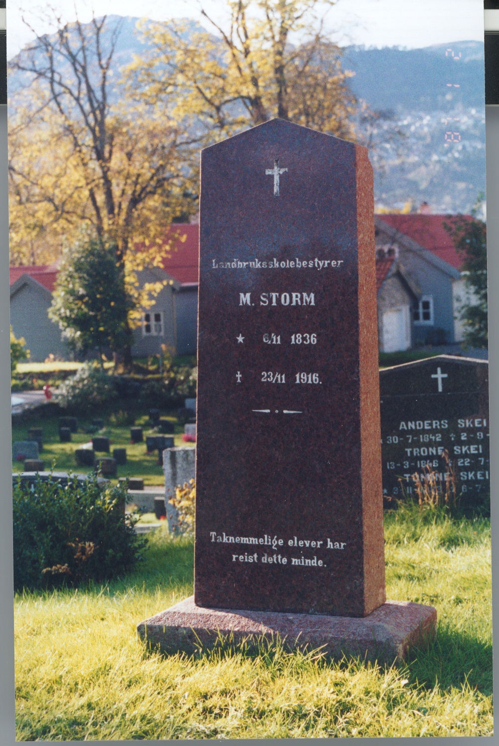 The stone is in polished, reddish granite with this inscription: "*Principal of agricultural school M. STORM* 6/11 1836 * 23/11 1916. * Grateful students have * donated this memorial".