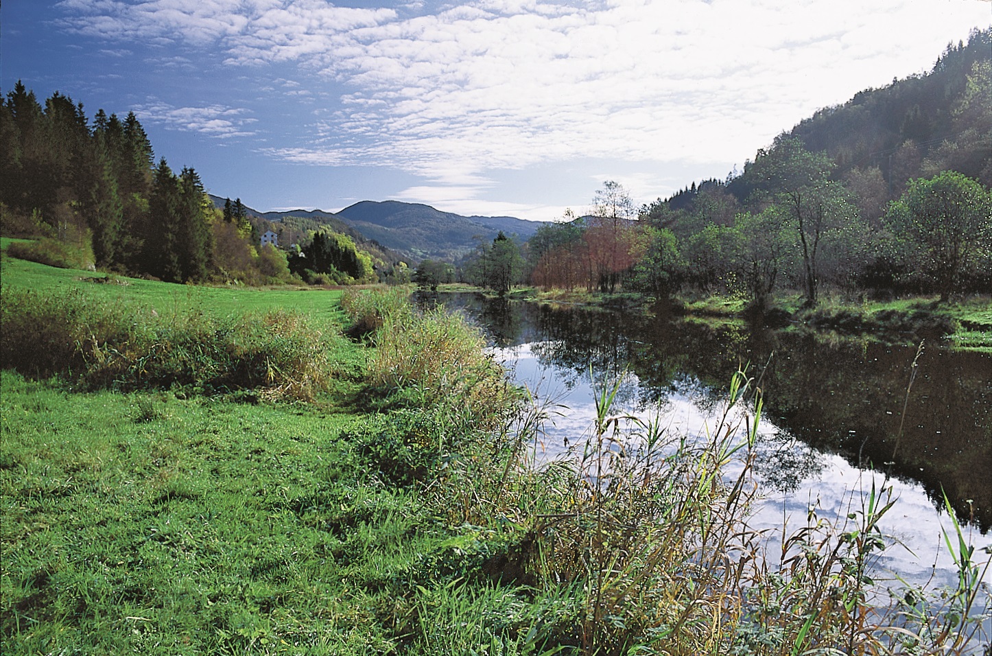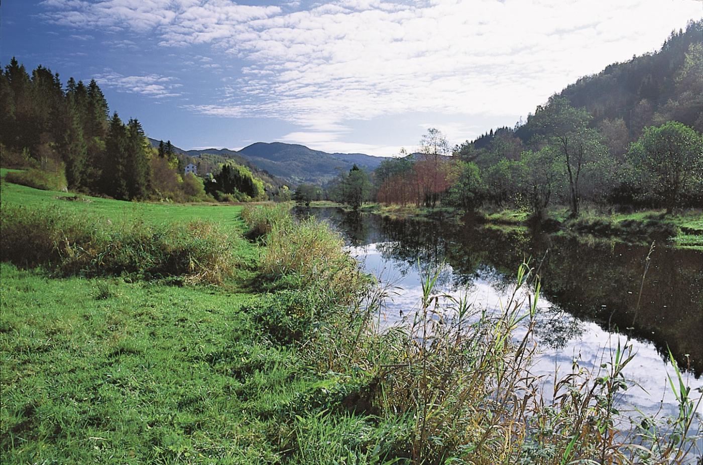 In the valley toward Lonevågen, the grassy hills stretch up the slopes and go over to leafy forest and spruce to give the valley a tone of sparkling green. In the middle of this, Lonelva river flows through the flat-lying fields. The river is perhaps one of the most insignificant salmon rivers in the country, with respect to its length and water volume. The water volume is in fact so little that there simply is not room for any big salmon. But, the Osterøy-salmon has adapted to the cramped living conditions, through genetic selection.