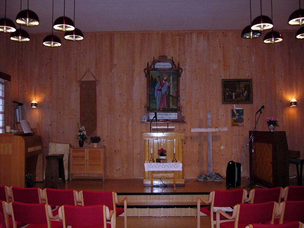 The interior of the 'bedehus': The rostrum, table with a bible, and a large Jesus picture on the wall behind. A cross standing on the floor. Two other pictures: Jesus and Pilate, and Jesus in the garden of Gethsemane. To the left of the rostrum hangs a tapestry made with a tatting technique. This was made by a seaman.
