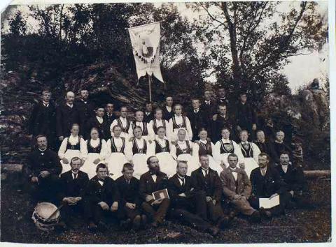 Nordstranda Kristelige Ungdomslag (Christian Youth Association), Stat 1899. On the banner we can read: "Forward and upward!" Under: "Nordstranden (..) Ungdomslag". The picture does not show if anything is written between these two words. The teacher Wilhelm Kvalheim from Vågsøy sits as number five from the left in the front row. He was a teacher at Selje for some years and for a while he was also chairman of the Nordfjord district of 'Norsk Kristeleg Ungdomsforbund'.