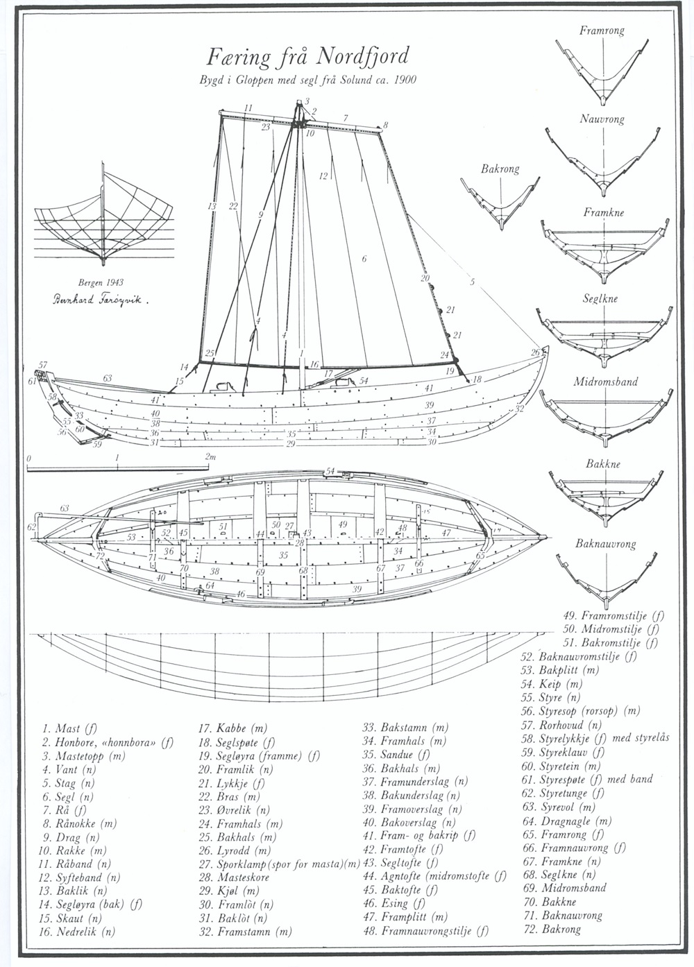 Fishermen and history writers along the Norwegian west coast has found much information from the first "Fiskarsoga for Sogn og Fjordane 1939 (history of fishermen of the county of Sogn og Fjordane)". Færøyvik edited this book and wrote himself the section on the boats used in fishing. In newspapers and magazines people could find pleasure in comprehensive explanations and articles about different boats along the entire coast, all careful scientific work embracing Norse times to the engine age. Based on this material, his son, Øystein Færøyvik - after Bernhard had passed away - wrote the book "Vestlandsbåtar. Frå oselvar til sunnmørsåttring (boats of the west coast. From simple rowboat to the Sunnmøre eight-oar vessel) ", which is the fifth volume of the collection "Norske båtar (Norwegian boats)".