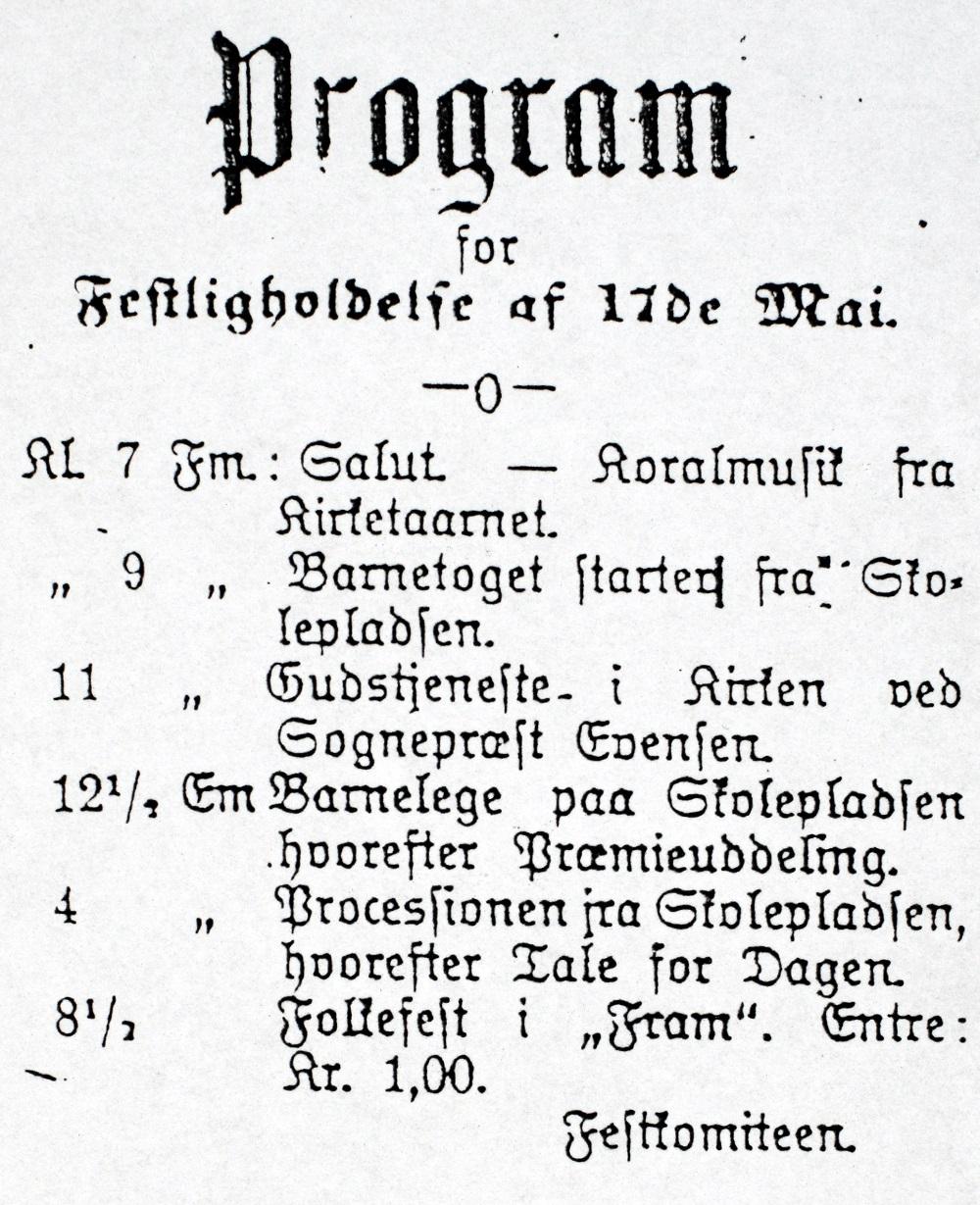 Liknande referat kan me finna frå mange stader. Skodespel og opplesing går att som program, saman med talar og song. Det var oftast eit ungdomslag som stod for tilskipinga, der det fanst slike. I Vadheim vart spelstykket "Til Sæters" vist fram, og i Kaupanger hadde dei utanom diktlesing, festavisa og talar ei framsyning som dei kalla tablå:" Det var 3 sætergjentor, klædde i nasjonalbunad som stod og skodde utyver, som saag dei noko langt, langt burte. Det tok seg makalaust fint ut, med dei mange farga ljos i den grønkledde feststova".