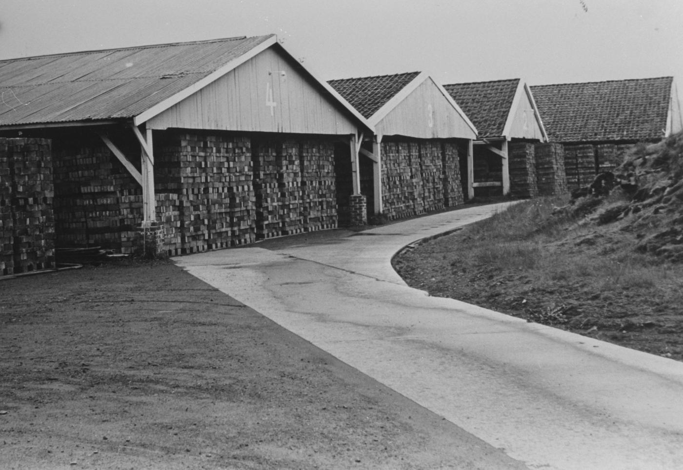 Bricks stored at Vårdal Teglverk. In 1955, a forklift truck was bought for lifting and transport. A track was also made of concrete. There were in all seven storage sheds.