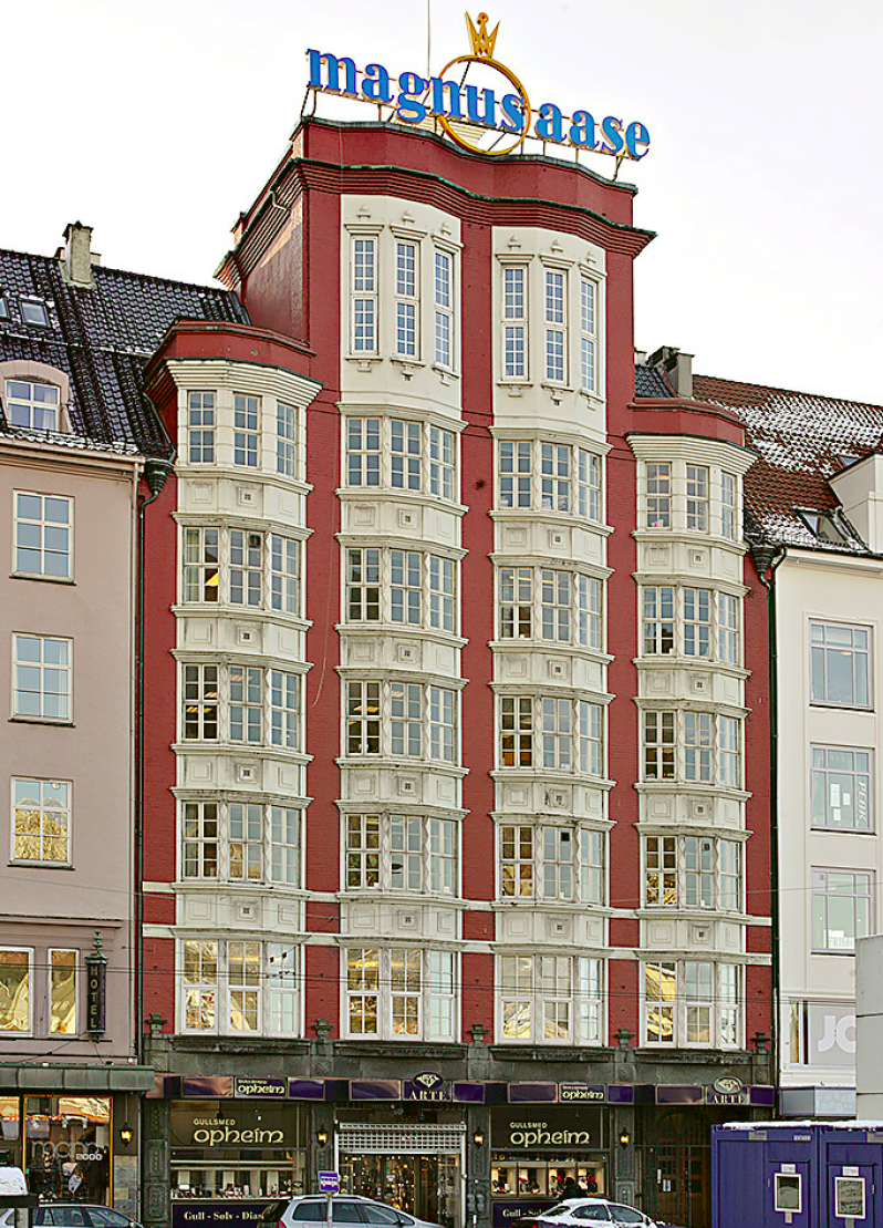 Aasegården er bygget i 1927. Byggherren sendte arkitekt Erlend Tryti til Amsterdam for å hente inspirasjon fra arkitekturen der og resultatet ble et bygg med store karnapp og ornamentering i upusset tegl. Bygget skiller seg ut i fasaderekken mot Strandkaien da alle gårdene her er bygget nesten samtidig, men er ulike i valg av materialer og dekor.