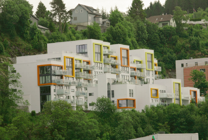 Petter Tenold i OG Arkitekter sier han ville ha litt humor inn i arkitekturen. Han tegnet opprinnelig fasadene på disse 67 leilighetene og syv rekkehusene som et tenkt familiebilde med personer i varierende høyde. Prosjektet fra 2012 vant utbyggerkonkurransen, men det er blitt noe endret underveis. Hovedblokken har fremdeles det opprinnelige uttrykket, og en varierende høyde som følger åskammen den ligger inn mot.