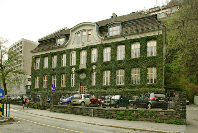 Handelsskolen på Tanks ble i 1899 utvidet til et handelsgymnas som flyttet inn i denne bygningen, tegnet av Jens Kielland i 1905. Skolebygningen ble i juli 1940 rekvirert av okkupasjonsmakten og brukt til Stadtkommandantur. I 1959 ble det reist et tilbygg ved arkitekt Paul Lambach som inneholder gymnastikksal og fire klasserom. Hordaland fylkeskommune overtok driften i 1976. Bergens Handelsgymnas holdt til i bygget til juni 2014 da handelsskolen ble nedlagt etter 110 års virksomhet, mens skolevirksomheten ble overflyttet til nye Amalie Skram videregående skole.