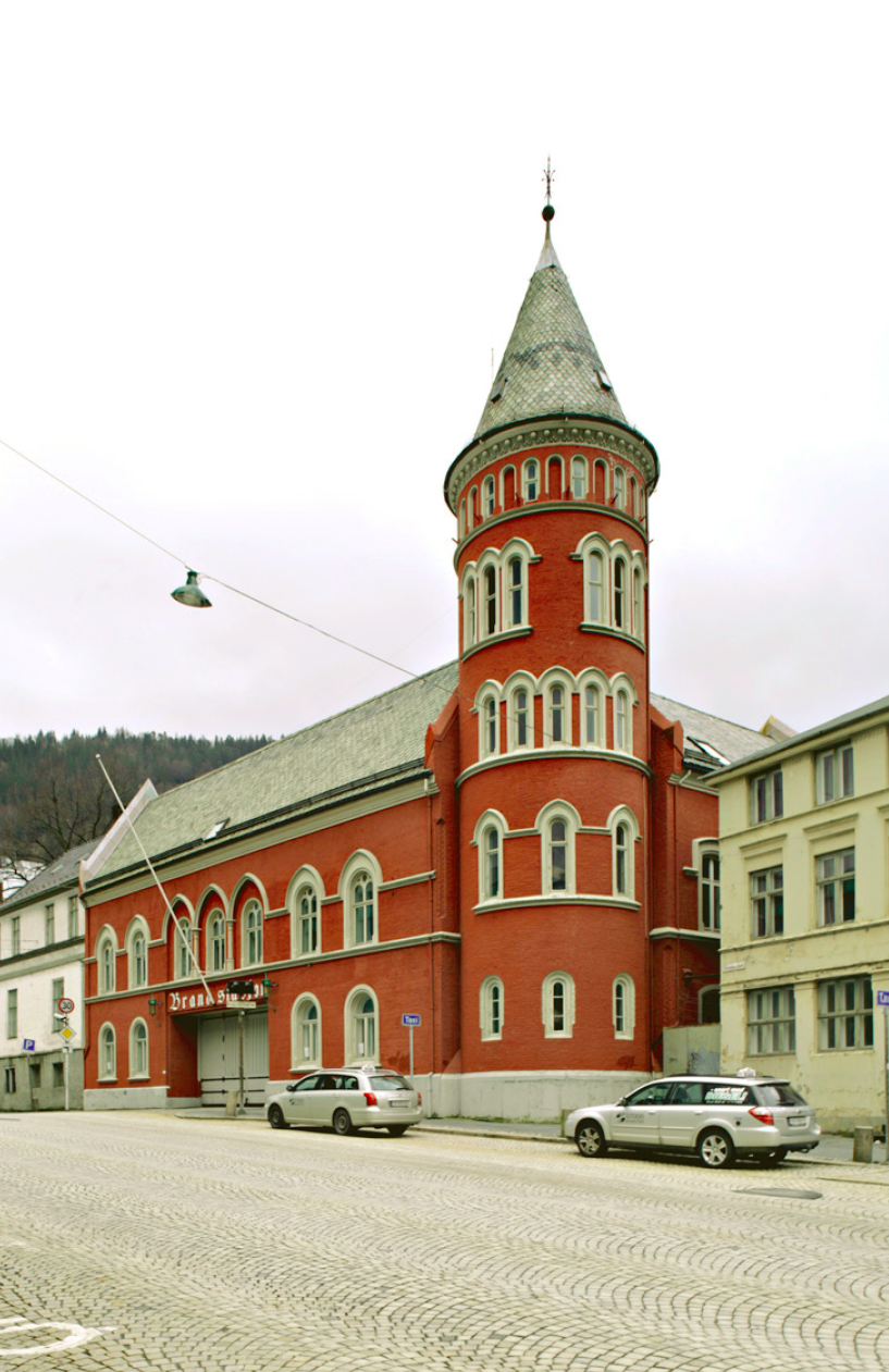 Brannstasjonen i nygotisk stil, tegnet av arkitekt Peter Andreas Blix i 1888, unngikk såvidt bybrannen i 1916. Stasjonen ble utbygget i flere omganger, senest av Kaspar Hassel i 1934 da bygningen fikk den brede utkjørselen i front. Bygningen var i bruk som hovedbrannstasjon til i 2007, da Bergen Brannvesen flyttet til ny brannstasjon på Nygårdstangen.