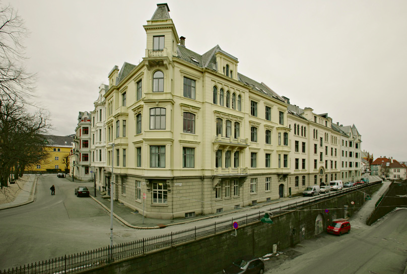 Det Nævdalske kompleks ble tegnet av Schak Bull og bygget mellom 1890 og 1915. Byggmester J.H. Nævdal hadde en stor plan. Ved hjelp av arkitekt Bull ville han bygge Bergens svar på Victoria Terrasse i Oslo. En 100 meter lang og praktfull fasade skulle ruve over sentrum fra høyden mellom Johanneskirken og Sydneskleiven. Luksusleiegårdene på Sydnesplassen var ferdige da krakket rammet Bergen i 1899. Disse fasadene var utstyrt med tårn og spir som senere er fjernet. Resten av prosjektet ble fullført av Nævdal, men med sterkt reduserte ambisjoner. Schak Bull ga Øysteins gate 3 en dempet jugendstil. Øysteins gate 1 ble overlatt til arkitekt S. Ellingsen og fullført i 1915.