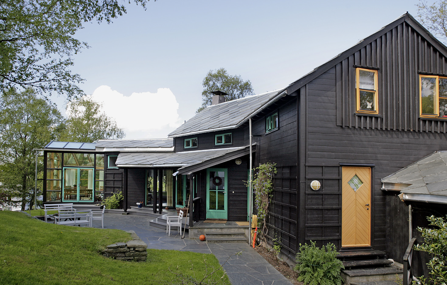 Enebolig som sammen med carport og garasje former et slags rekketun. Bygningene er tegnet av Kristian Bech i 1988 og er organisk tilpasset terrenget