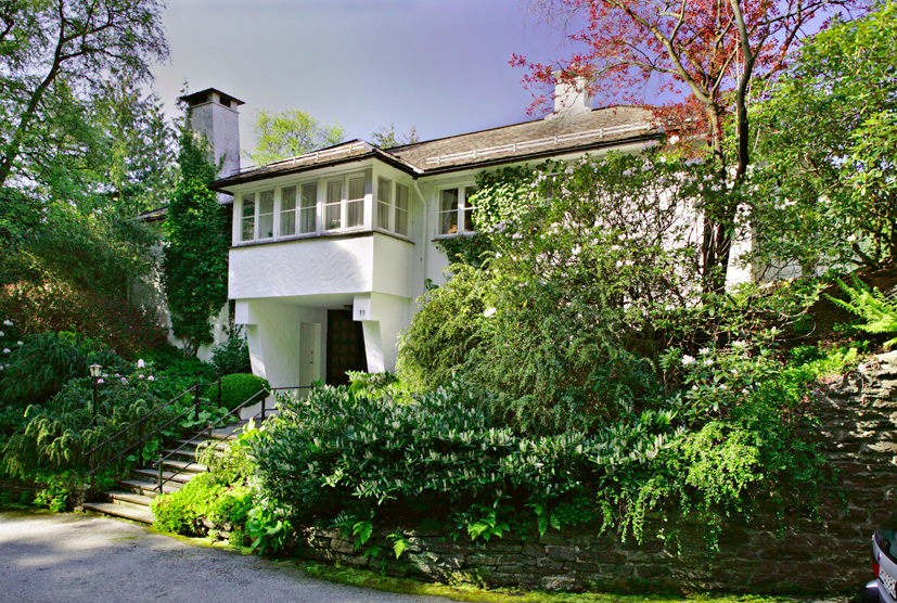 En lav, fin bolig i hvitpusset mur som ligger i et flott gateløp med rause tomter og mange arkitekttegnede villaer.