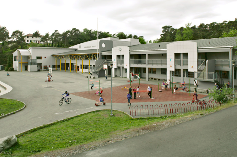 Fjellsdalen skole med den lyse fasaden står i fin kontrast til den omliggende vegetasjonen. Skolen ble tegnet av Mette og Morten Molden i 1997.