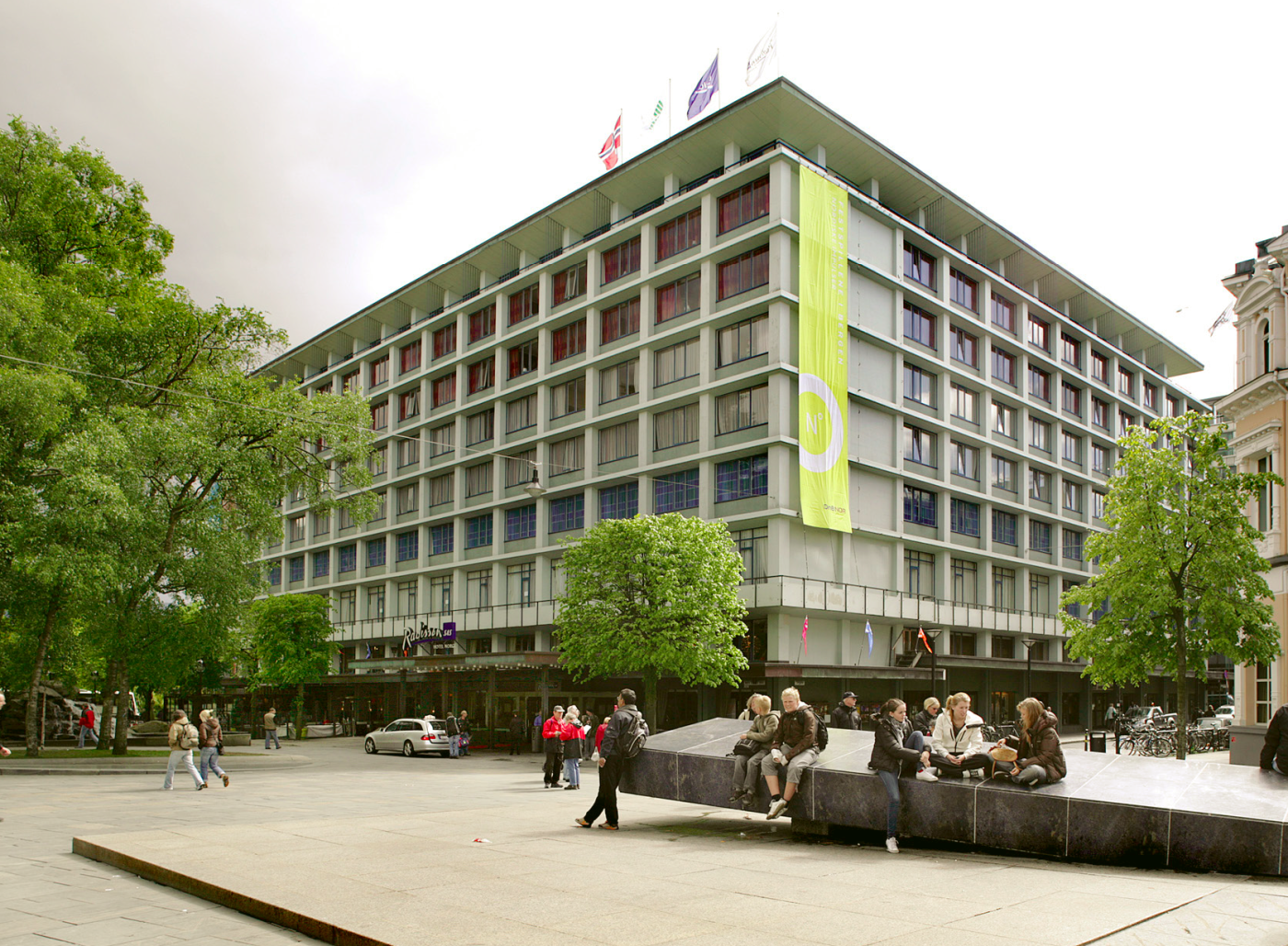 Hotel Norge på Ole Bullsplass ble tegnet av Halfdan B. Grieg i 1964 og erstattet da det gamle hotellet fra 1885 som ble om- og påbygget, brannskadet i 1916 og revet i 1961. Hotel Norge fremstod nå som et gjennomarbeidet, lite prangende, men markant sentrumsbygg. Den velproporsjonerte hotellbygningen er moderne, men tidløs. Det har fått et senere tilbygg i glass mot Olav Kyrres gate ved Arkitektkontoret Grieg.