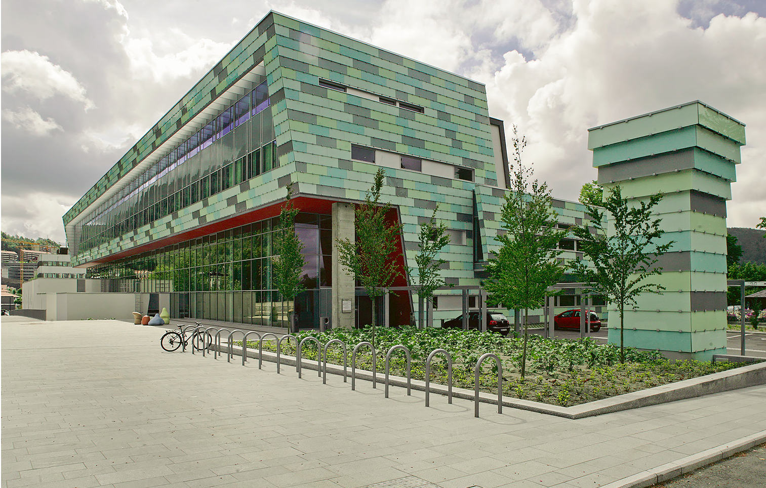 Bygningsmassen er utformet som en samlende form i to etasjer mot vest som løfter seg til fire etasjer mot øst. En gjennomgående innvendig vandrehall knytter huset sammen på langs. Den rødlige fargen her er valgt som kontrast til den mer kjølige fargebruken på glasspanelene i øvrige fasader.