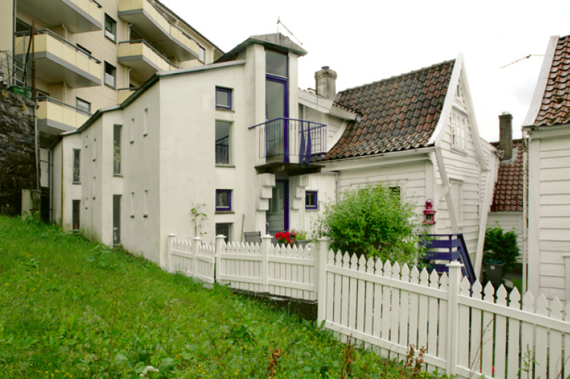 Et gammelt bergenshus i Pyttergrenden har fått et tilbygg i leca. Nykommeren, som beriker trehusmiljøet, har fått plass i bakhagen. Bygningen ble tegnet av Steinar Enehaug i 1991 og den pryder diplomet som følger Bergen kommunes byggeskikkpris, som ble utdelt fra 1995.