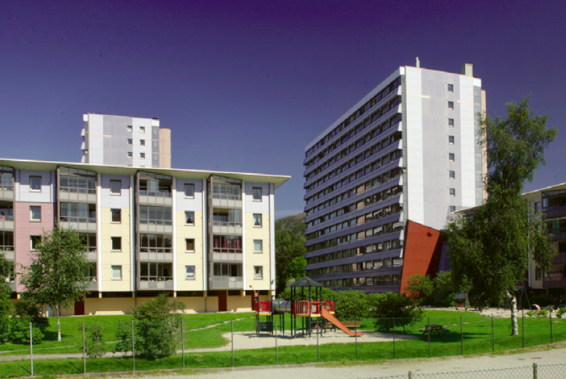 Både bygningene og utearealene er rehabilitert som del av et stort områdeløft i Loddefjord bydel. Betongblokkene er etterisolerte og har fått innglassede altaner.