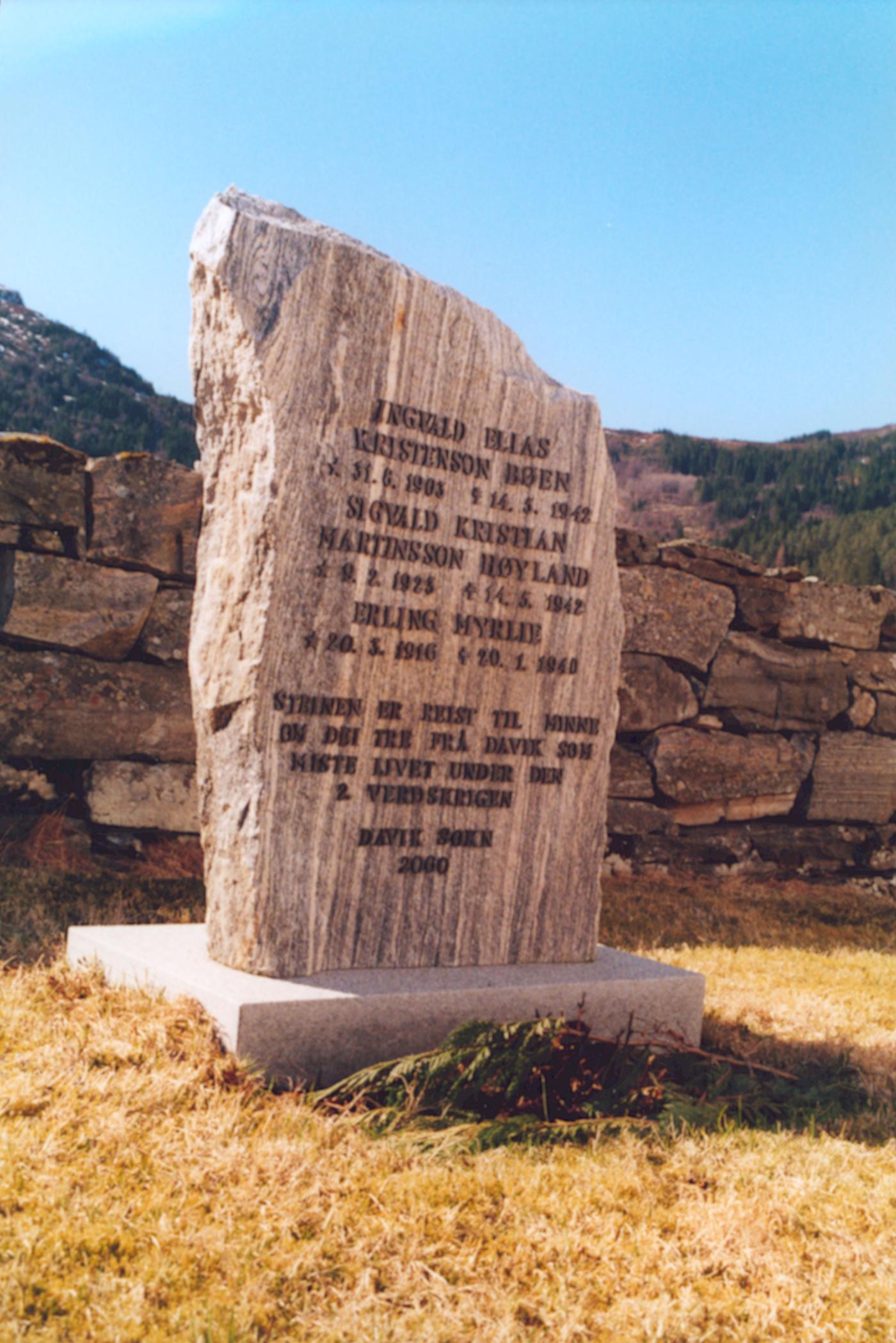 The Davik "sokn" council took the initiative to erect the memorial stone. The stone was found at the birthplace of Ingvald Bøen, one of the three who died.