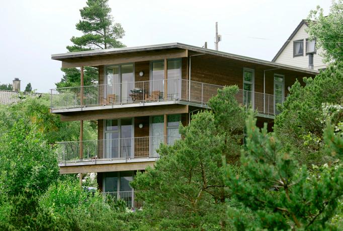 Alle rom har utgang til aluminiumstrerrassen som løper rundt huset i tre etasjer.