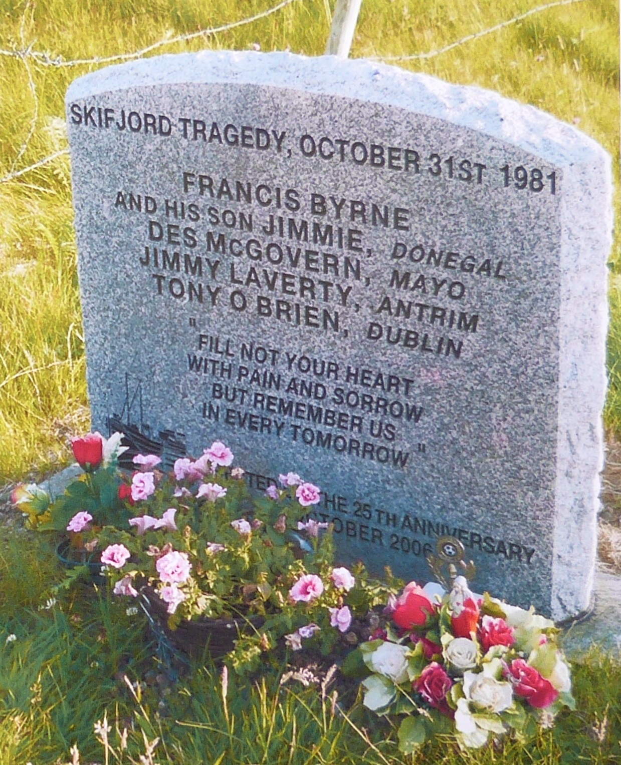 The SKIFJORD TRAGEDY – skjedde 31. oktober 1981. Fem menneske miste livet. Først står innhogge: Francis Byrne, deretter: sonen Jimmie, begge frå fylket (county) Donegal. Vidare: Des Mac Govern frå Mayo, Jimmy Laverty frå Antrim og Tony O Brien frå Dublin. Under namna står ord om smerte og sorg:
