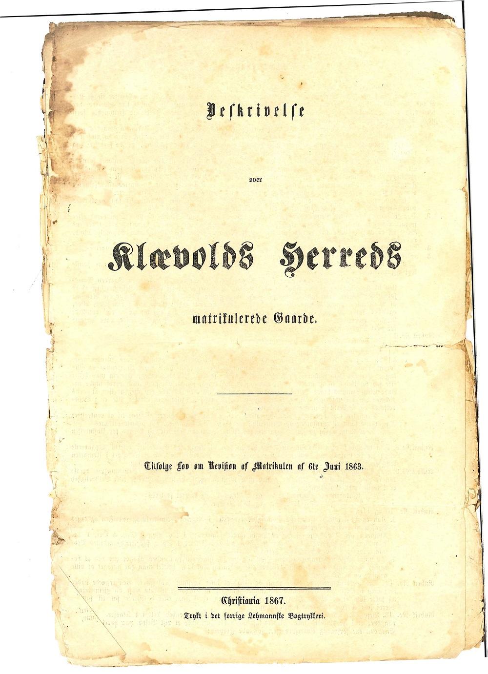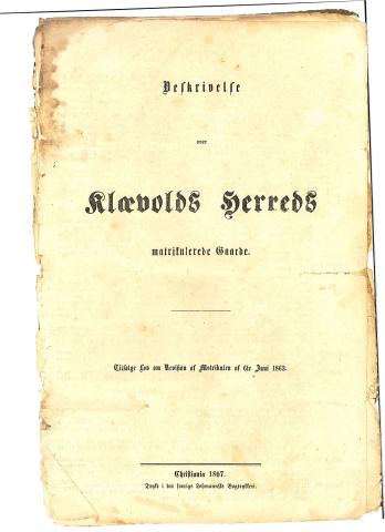 Den trykte ”Beskrivelsen” over ”Klævolds Herreds matrikulerede Gaarde Tilfølge Lov om Revision af Matrikulen af 6te Juni 1863” er eit døme på resultatet av arbeidet til dei særleg oppnemnde kommunale kommisjonane/komiteane sitt arbeid med den nye matrikkelen. Vi skal sjå litt nærare på innhaldet.