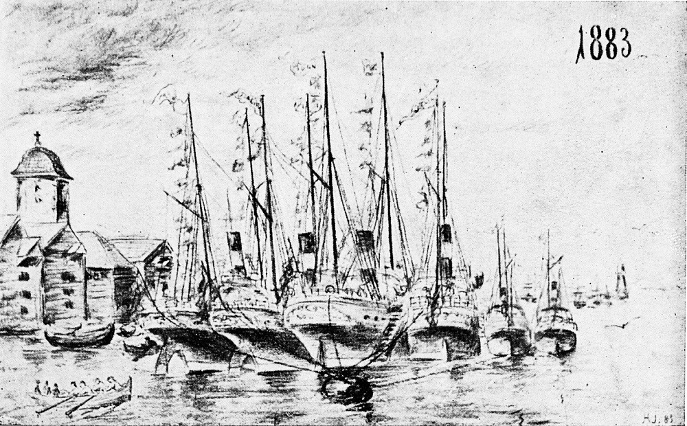 Flaggpryda amtsskip til kai i Bergen 2. desember 1883. Fylkesbaatane hadde dette året i alt seks skip: fire større og to mindre. Det står spesifikt i årsmeldinga for året 1883 at dei fire store skipa var i Bergen. På teikninga er dei to små også med. Om dei også var i Bergen, eller om det er teiknaren som har skøytt dei på, veit vi ikkje.