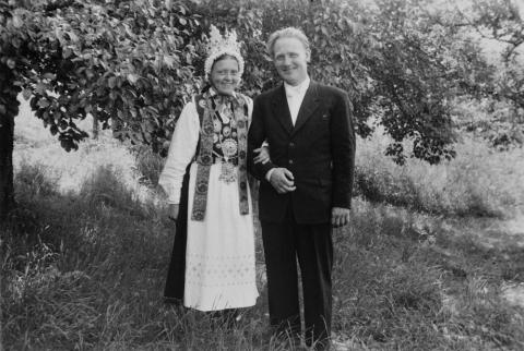 Brudeparet Ingrid Johanna Skarstein (f.1920) og Bjarne Hermundson Geithus busette seg i Vik i Sogn. Ingrid var krunebrud og biletet er teke på garden Geithus, der festen var.