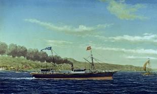 DS "Framnæs", første skipet til Fylkesbaatane i rute Bergen - Sogn, 2. desember 1858, skipingsdato/år for Fylkesbaatane i Sogn og Fjordane. Maleriet er datert 1859. Skipet har tre kjennemerke: skipsnamnet, skorsteinen: raudt band på svart botn, og flagget: blått kryss i kvitt rektangel på raud botn.