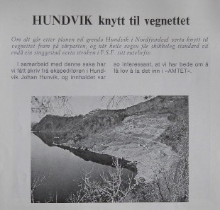 "Til det kan eg svara at for ekspedisjonen Hundvik har det lite å seia kor sommarrutene vert lagde. Bygda har fått sitt lenge ettertrakta ynskje oppfylt med vegtilknytning til bygda. Det har vore arbeidt med vegen dei 2 siste åra og bana er brote opp so det er berre å gjere i stand siste stubben. Dette vil seie at eit stykke er gamal kvalitet som vinterstid kan vere vanskeleg å bruke på grunn av stor stigning og vanskeleg å få pløgt, men vonar ogso dette stykket vert nybygt snart. Av den grunn kan det vere av interesse av anløp av og til med mjøllast frå Bergen, eller andre tunge varer her frå fjorden. So vonar vi kan få anløp av «Ster» [FSF-leigebåt i lasterute] i slike høve.»