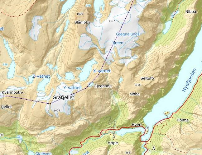 Same korleis dette heng saman, er fjellpartiet kring Gjegnen utruleg imponerande, der Blånibba ragar 1670 m over fjorden, med evig bre under toppen. Fjellet er eit populært turmål, og vi kan overnatte i turhytta Gjegnabu, 1200 moh. Og vatnet frå breen gjev oss elektrisk energi frå Yksneelvane Kraftstasjon. Kikkar vi på kartet, finn vi tre små vatn oppe i høgfjellet med dei merkelegaste namna i landet: X-vatnet, Y-vatnet og Z-vatnet. Det kan vel ikkje vere andre enn kraftverksbyråkratar som har sett på slike namn, etter tre ukjende faktorar. Gjegnabu ligg nær X-vatnet.