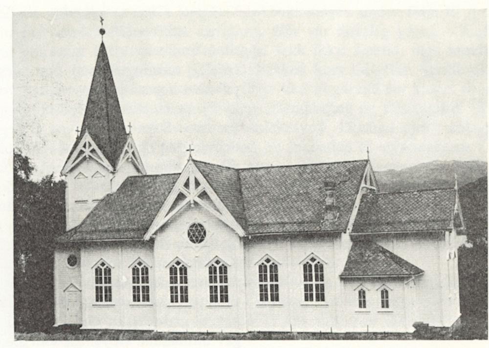 Sett utanfrå er vindauga blikkfang i dei to små utbygga på langsidene. Begge er utstyrte med kryssband i mønegavlane. Tårnet i vestre enden har tilsvarande gavlar i mindre format. Det er denne byggjeforma som gir kyrkja dette ekstra stilfulle preget, og som får ein til å tenkje på dei gamle krosskyrkjene. Sjølve tårnfoten er våpenhus, og har små tilbygg på kvar side, med oppgang til galleriet. I små rom under trappene vart det til 50-årsjubileet i 1960 sett inn toalett. Attåt koret i austenden er dåpssakristi og prestesakristi som vart bygde samstundes med kyrkja.