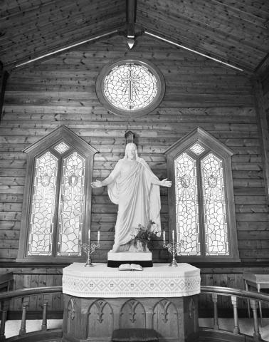 Preikestolen er i tre med utskjeringar, m.a. med treeiningssymbol. Kyrkjerommet, og mykje av inventaret, er også dekorert med utskjeringar. Til dømes den åttekanta døypefonten i tre. Dåpsfatet og dåpsmugga er i sølv. Alle desse er frå 1910.