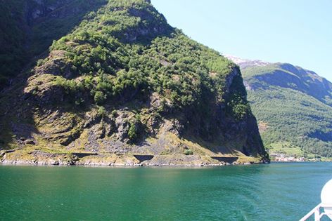 «På styrbord side (eller babord, alt etter fartsretninga), kan vi nå sjå ein veg som blei påbegynt på 1950-talet men aldri avslutta. Planen var å byggja veg frå Undredal langs fjorden inn til Flåm. Den vesle vegstubben går frå påhogget til ein tunnell innover langs fjorden om lag ein kilometer. Som vi kan sjå går vegen fleire stader på oppmurte fundament, som på den tida møysommeleg vart utført ved handemakt. Bygda Undredal fekk seinare vegsamband sørover til to svære tunnelar tvers gjennom fjellet mellom Flåm og Gudvangen.»