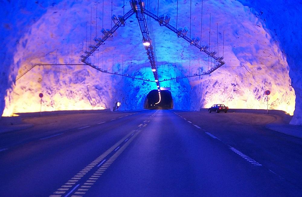 Tidleg i planfasen vart det avgjort at tunnelen skulle delast inn i fire delstrekningar på 6 km. I overgangen mellom kvar strekning vart det planlagt rundkøyringar, der bussar og vogntog ville få god plass til å snu utan å ryggja. Dette vart etter kvart utvikla til tre store fjellhallar midt inne i tunnelen som fekk ein diameter på 28 m. Eit anna verkemiddel var illusjon av dagslys. Forsøk viste at lyssetjinga av hallane avgjorde om trafikantane følte at køyreturen var monoton eller ikkje. Fjellhallane seinka også farten.