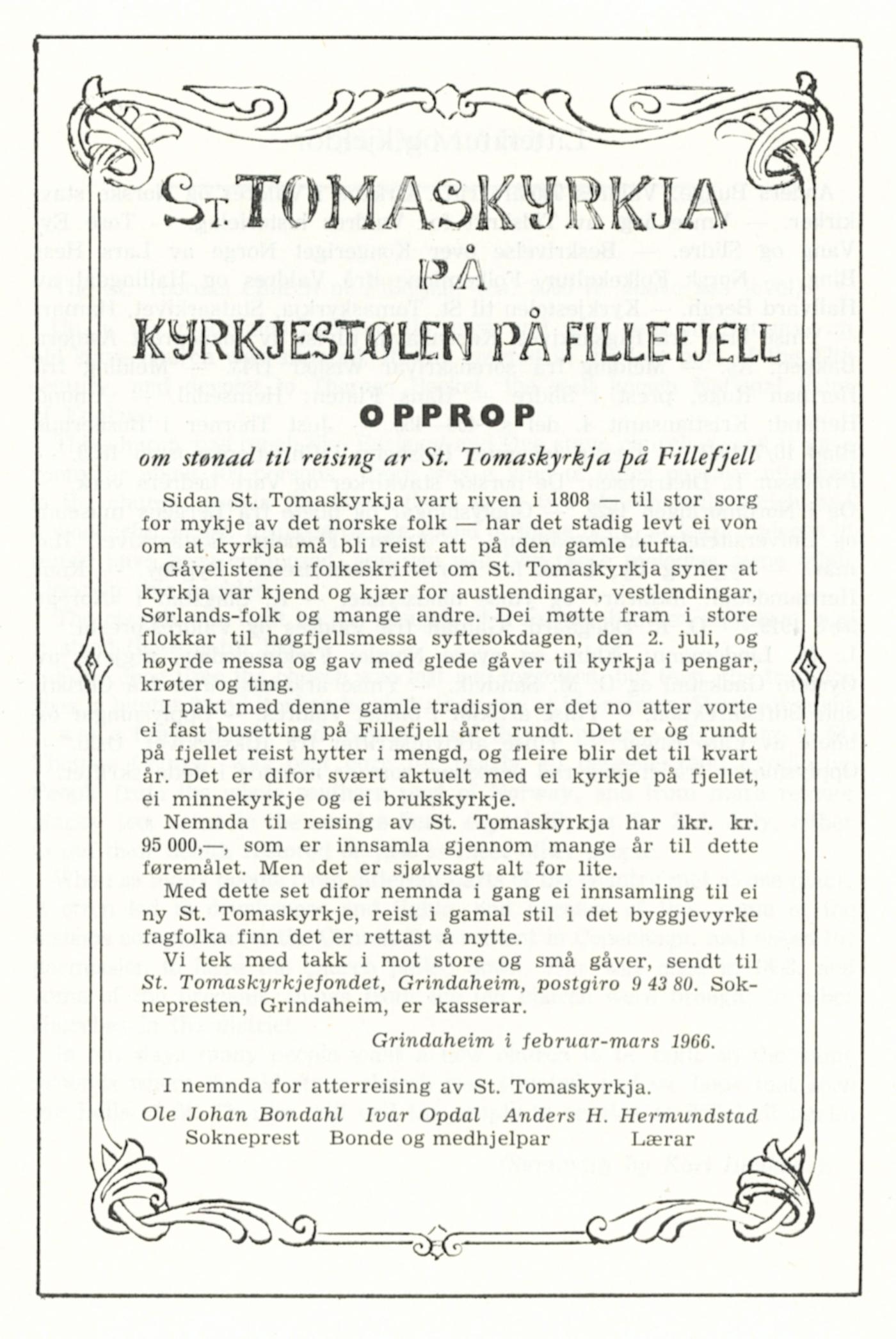I 1960-åra byrja for alvor arbeidet med å få reist ei ny St. Tomaskyrkje på om lag same staden som den gamle hadde stått. I 1966 vart det laga eit opprop om stønad til reising av St. Tomaskyrkja på Filefjell. Bak oppropet stod "Nemnda for attreising av St. Tomaskyrkja". I leiinga for nemnda var soknepresten i Vang, Ole Johan Bondahl, bonde Ivar Opdal og lærar Anders Hermundstad. Av oppropet går det fram at dei til då hadde samla inn 95 000 kr, men at dei oppmoda folk til å gi meir då dette var for lite til å få oppført ei høvande kyrkje. Seinare overtok Kjell T. Lund som sokeprest i Vang og leiar av attreisingsnemnda. Nemnda fekk etter kvart 12 medlemer, frå Vang, Lærdal og Årdal.